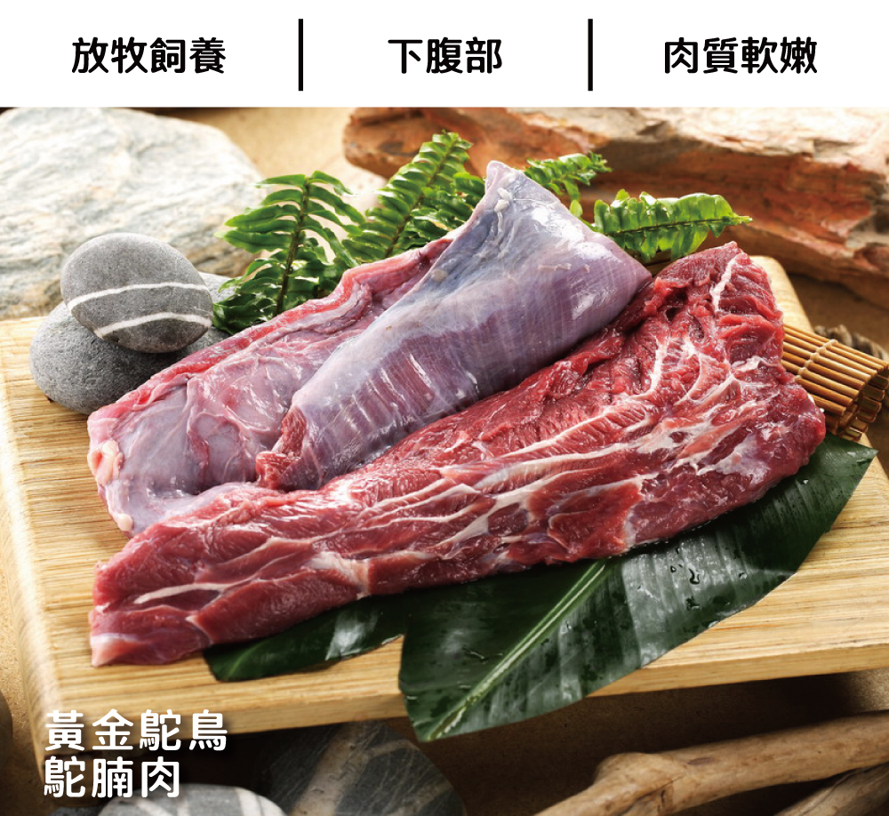 鴕鳥腩肉口感像牛腩肉,肉質較腱肉軟嫩,適合燉煮來自彰化的鴕鳥採天然放牧飼養,吃牧草不打抗生素,肉質紮實但不緊迫。